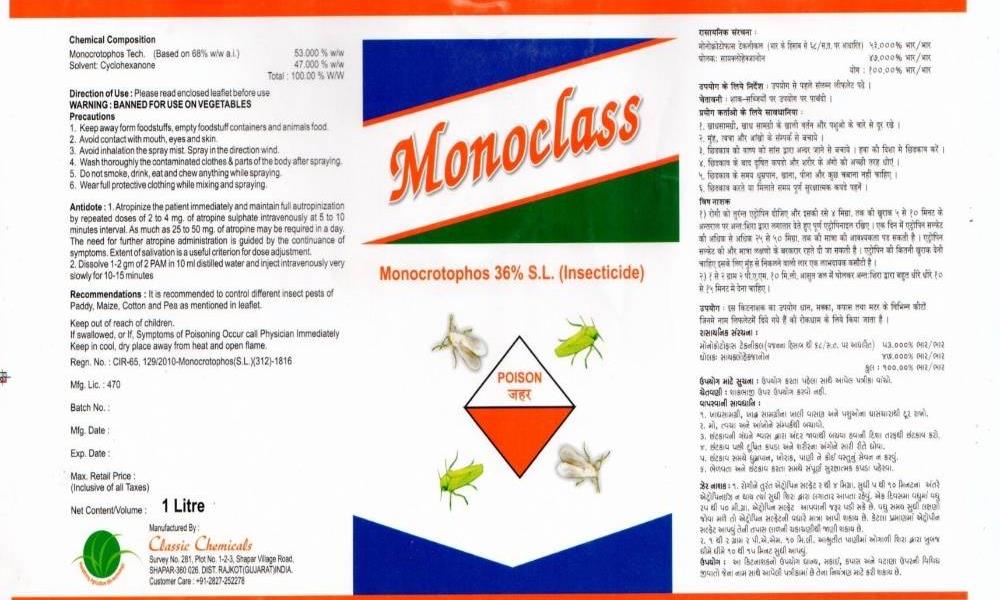 MONOCLASS contains 36% of Monocrotophos in Soluble Liquid formulation. Monocrotophos belong to organophosphate group of insecticide and it is systemic in nature. Monoclass is able to control sucking and chewing type of insects in different crops. It is cholinesterase inhibitor and disrupts nerve impulse transmission by acting in synaptic regions.
